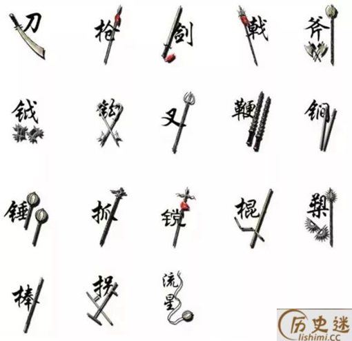 最早是汉武帝经过严格的挑选和整理,筛选出18种类型的兵器:矛、镗、刀、戈、槊、鞭、锏、剑、锤、抓、戟、弓、钺、斧、牌。棍、枪、叉。
