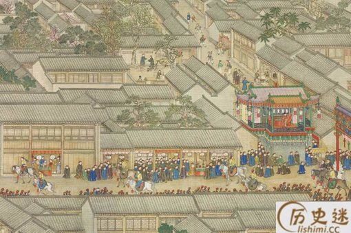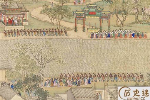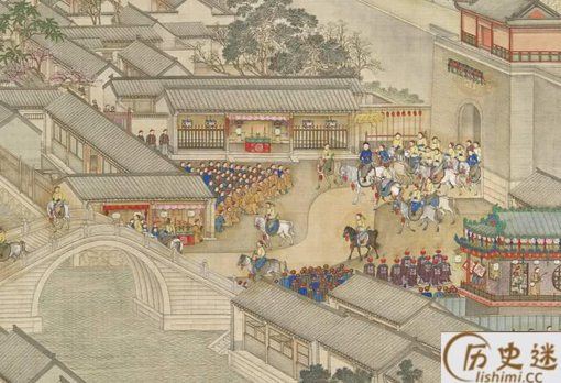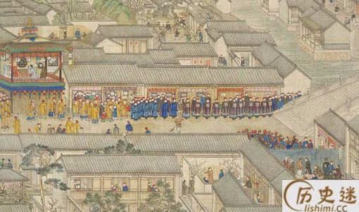 上图是乾隆皇帝南巡时,江南地方官员和百姓在接驾场面。乾隆在大批御前侍卫的促拥下,进了城门。城门两侧边跪着是江南巡抚,总督、知府等高官,他们都非常整齐跪着迎接乾隆的到来。城门的左侧还置放了香案,右侧的戏台正在唱戏。