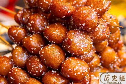 4、糖油果子:这个也是成都非常本土的特色小吃,像冰箱葫芦一样一个个的串起来,真的是做到了色香味俱全,不仅仅是味道好,而且还能作为拍照道具。只要几块钱。不要怕它是重油重糖,偶尔吃一次,不会长多少肉。但是它很容易饱腹,所以建议跟朋友一起买一串就可以了。