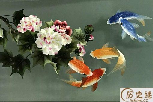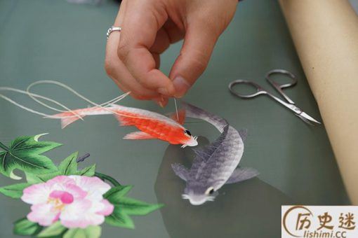是用于绣物上添色或调和色彩,运用一种稀疏不规则的针脚撒上去,隐约的显现一种色彩。适用于绣金鱼的尾尖、雀鸟尾子和脊椎花纹等。