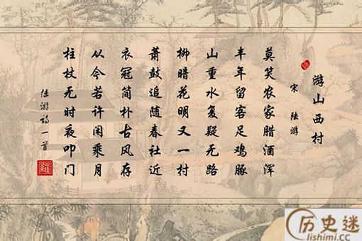 公元1167年的初春时节,陆游选择了出门游历,但他走到了家乡附近的一座山坡的时候,偶遇一家农户正巧在杀鸡猪肉招待着客人。虽是浑酒一杯,却醇香四溢,时令恰在春节之际,陆游心生感慨,挥笔写下“莫笑农家腊酒浑,丰年留客足鸡豚。山穷水复疑无路,柳暗花明又一村。”《游山西村》,这首七言律诗自此成为千古名篇。