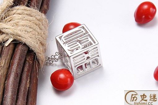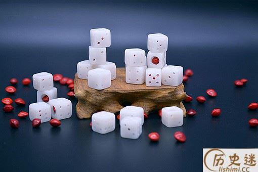 骰子: 唐朝时贵族闺阁间流行的一种玩物,最初以象牙制成,镂空后镶嵌红豆,黑色一头朝里,红色一面朝外。制成之后,精致玲珑,六面皆红。