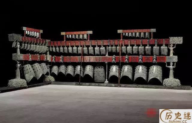 战国早期。1978年湖北随县曾侯乙墓出土。钟架长748厘米,高265厘米。全套编钟共六十五件,分三层八组悬挂在呈曲尺形的铜木结构钟架上,,最大钟通高152.3厘米,重203.6公斤。每件钟均能奏出呈三度音阶的双音,全套钟十二个半音齐备,可以旋宫转调。音列是现今通行的C大调,能演奏五声、六声或七声音阶乐曲。曾侯乙编钟的出土改写了世界音乐史。