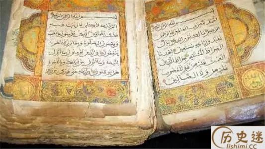 这本牛皮封面手抄描金《古兰经》长26.6厘米、宽20厘米、厚6厘米,装帧考究。用硬牛皮精心制作封面,纸质为精心加工的麻纸,纸中加入了很细的棉或丝纤维。经文墨色匀称,阿文书写流利,隽秀。书页中每个篇章的边框均有描金装饰,图案为花卉和阿文。每个阿文经文字行间还有明代惯用的阿文小注。由于年代久远,这本《古兰经》纸质已变黄、发脆,边缘有些破损、掉渣。