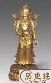 铜鎏金观音造像,国宝级文物。由明朝皇帝赐给青海著名的瞿坛寺。该器物身姿婀娜,站立在莲花座上。衣饰线条流畅飘逸,面含微笑,表情慈和,遍体鎏金。其铸造工艺代表了明代的最高技术水平。