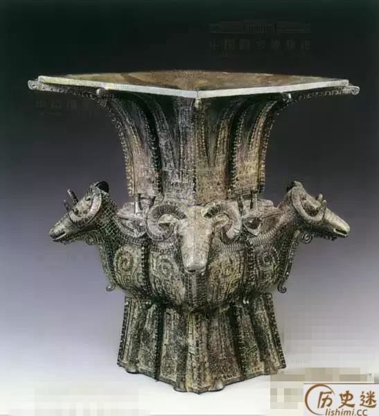 四羊青铜方尊,上口最大径44.4厘米、高58.6厘米、重34.6千克,在现存商代青铜方尊之中体型最大。造型雄奇,肩部、腹部与足部作为一体被巧妙地设计成四只卷角羊,各据一隅,在庄静中突出动感,匠心独运。整器花纹精丽,线条光洁刚劲。通体以细密云雷纹为地,颈部饰由夔龙纹组成的蕉叶纹与带状饕餮纹,肩上饰四条高浮雕式盘龙,羊前身饰长冠鸟纹,圈足饰夔龙纹。方尊边角及各面中心线,均置耸起的扉棱,既用以掩盖合范痕迹,又可改善器物边角的单调,增强了造型气势,浑然一体。