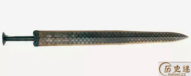 春秋晚期。1965年湖北江陵望山1号墓出土。长55.7厘米,宽4.6厘米。剑身中脊起棱,饰黑色菱形花纹。正面近格处有“越王勾践,自作用剑”的鸟篆铭文。剑格正面嵌蓝色琉璃,背面绿松石。