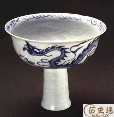 元代青花云龙纹高足碗,高11.4厘米,口径13厘米。现藏于吉林省博物馆。侈口,深腹。高圈足上有三道凸弦纹,呈竹节状。口沿为青花唐草纹。内壁暗花印行龙二条。外壁用青花绘一游龙,并衬以火焰纹。青花色泽青翠浓艳,线条流畅有力,堪称元代青花瓷器中的珍品。