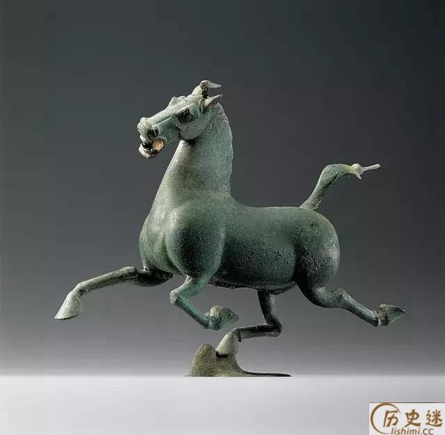 东汉,武威市雷台汉墓出土,通高34.5厘米,长45厘米,宽13.1厘米,重7.3千克。造型矫健精美,作昂首嘶鸣、疾足奔驰状。塑造者摄取了奔马三组腾空、一足超越飞鸟的刹那瞬间。让飞鸟回首惊顾,更增强奔马疾速向前的动势。其全身的着力点集注于超越飞鸟的一足上,精确地掌握了力学平衡原理,具有卓越的工艺技术水平。