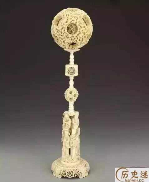 清代云龙人物纹转心象牙球,全高52.2厘米,上为一直径12.9厘米的大球,镂雕祥云缭绕,十余条健龙或藏头露尾、或藏尾露首穿行于云层之间;大球内分层透雕二十一个小球,球球相套,层层能转,满地纹饰。三节台柱,上为六层透雕小象牙球,纹饰同顶上之大象牙球;下有四足座,座上雕人物顶柱状承盘,玲珑剔透巧夺天工的雕刻工艺令人叹为观止。