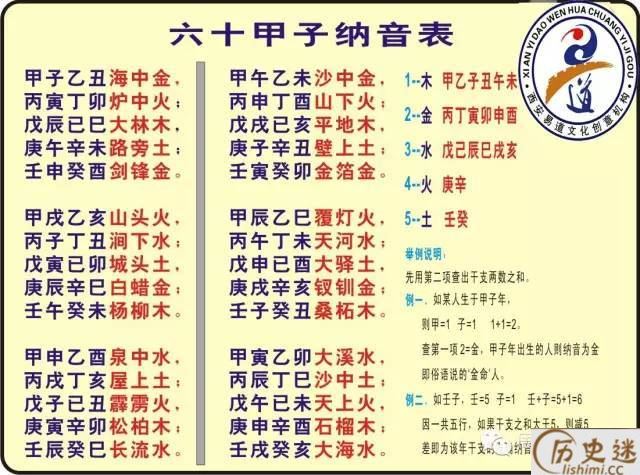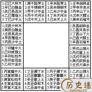 庚子辛丑壁上土,壬寅癸卯金箔金。 甲辰乙巳覆灯火,丙午丁未天河水,