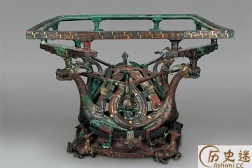1977年河北平山中山王墓出土,现收藏于河北省文物研究所。长47.5 厘米,宽47 厘米,高36.2厘米,案面已朽,仅存铜质方案座。案座底盘为圆形,由两雄两雌四只跪卧的梅花鹿承托,上面昂首挺立着四条双翼双尾的神龙。龙的双翼在内部中央聚合成半球形,双尾向两侧环绕,反勾住头上的双角。龙尾盘绕处连接四只展翅的凤鸟。四条龙的龙头分别托起一件一斗二升式的斗栱,斗栱托起案框。斗栱是按照当时木构建筑的挑檐结构设计而成,是我国迄今发现最早的战国时期的斗栱应用实例。案框一侧有铭文:“十四祀,右使車(厙),啬夫郭、工疥。”