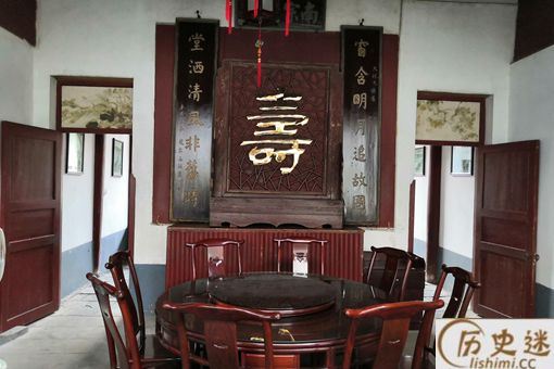 这间是第三间堂屋,相比前面两间,看起来要小很多。在墙上可以看到挂了一个很大的寿字,喻意寿比南山。