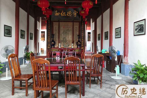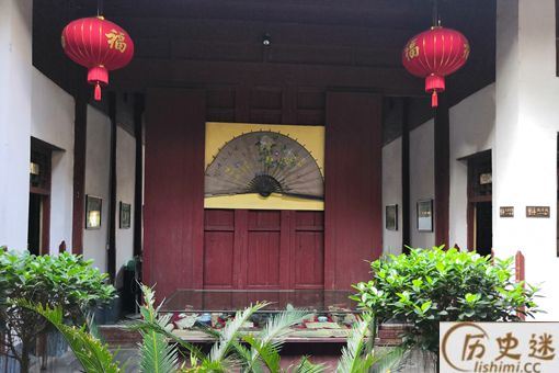 这是第二个堂屋的背面,墙上挂了一把很大的扇子,在旁边还有一个玻璃柜,里面摆放了一些古玩。