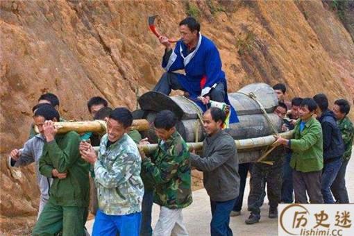 还好前来送殡的队伍里,还有年轻的壮汉,听说棺材抬不起来,就主动来帮忙。于是又添了一条绳子,加了一条杆,然后按照前面的程序再走一遍。
