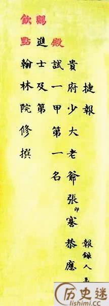 相比唐宋,明清时期的录取通知书就比较简单了。《儒林外史》中范进的录取通知书是这样写的:“贵府老爷范讳进,高中广东乡试第七名‘亚元’,京报连登黄甲。”