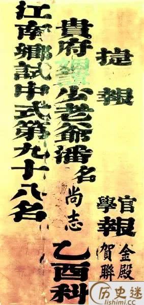 明王世贞《觚不觚录》:“诸生中乡荐,与举子中会试者,郡县则必送捷报,以红绫为旗,金书立竿以扬之。”这里的“捷报”就是古人的录取通知书了,也称“报帖”“喜报”。
